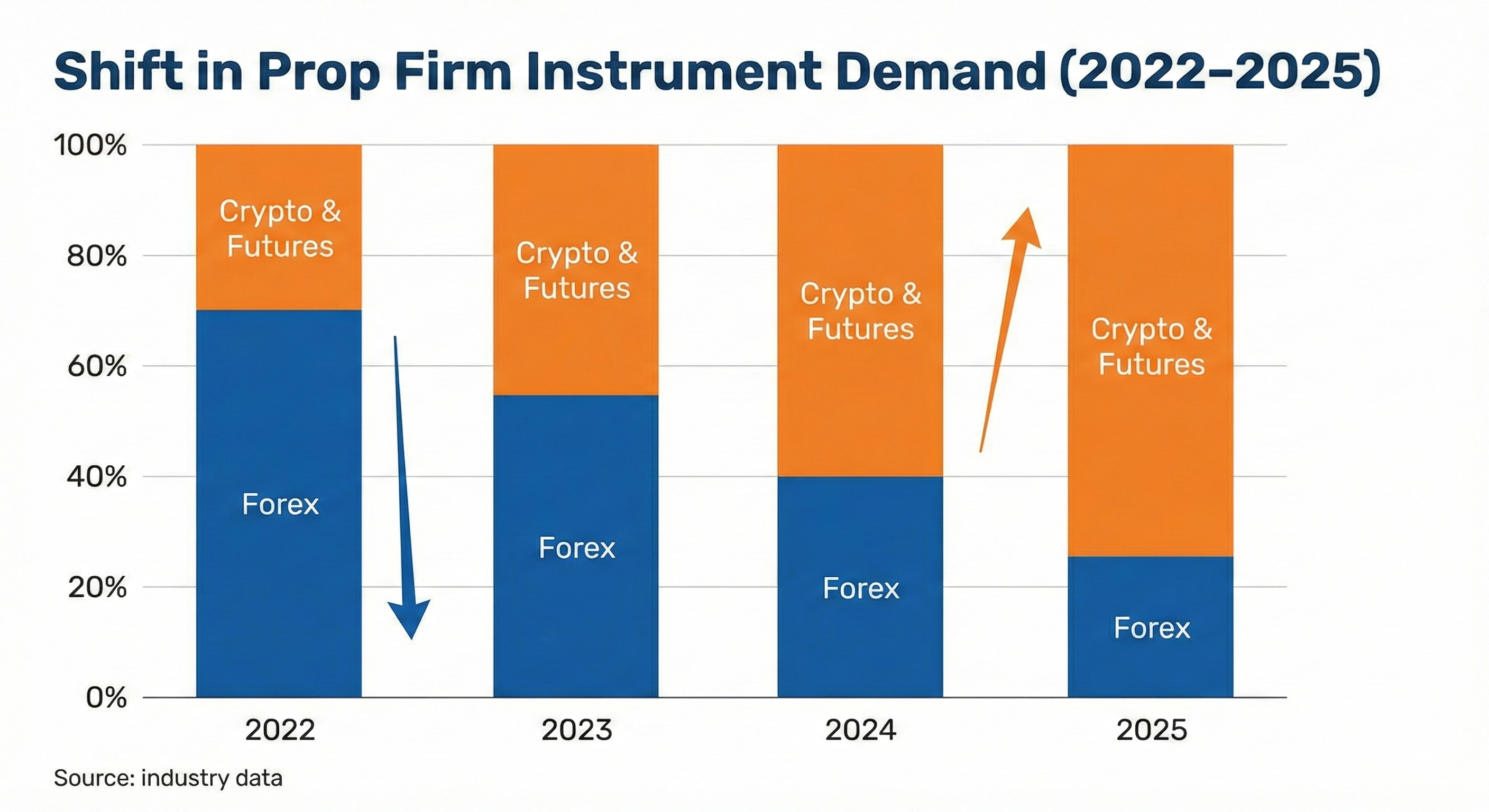 Bar chart showing the composition shift in prop firm instrument demand 2022–2025, with forex share declining as percentage of total while crypto and futures demand grows