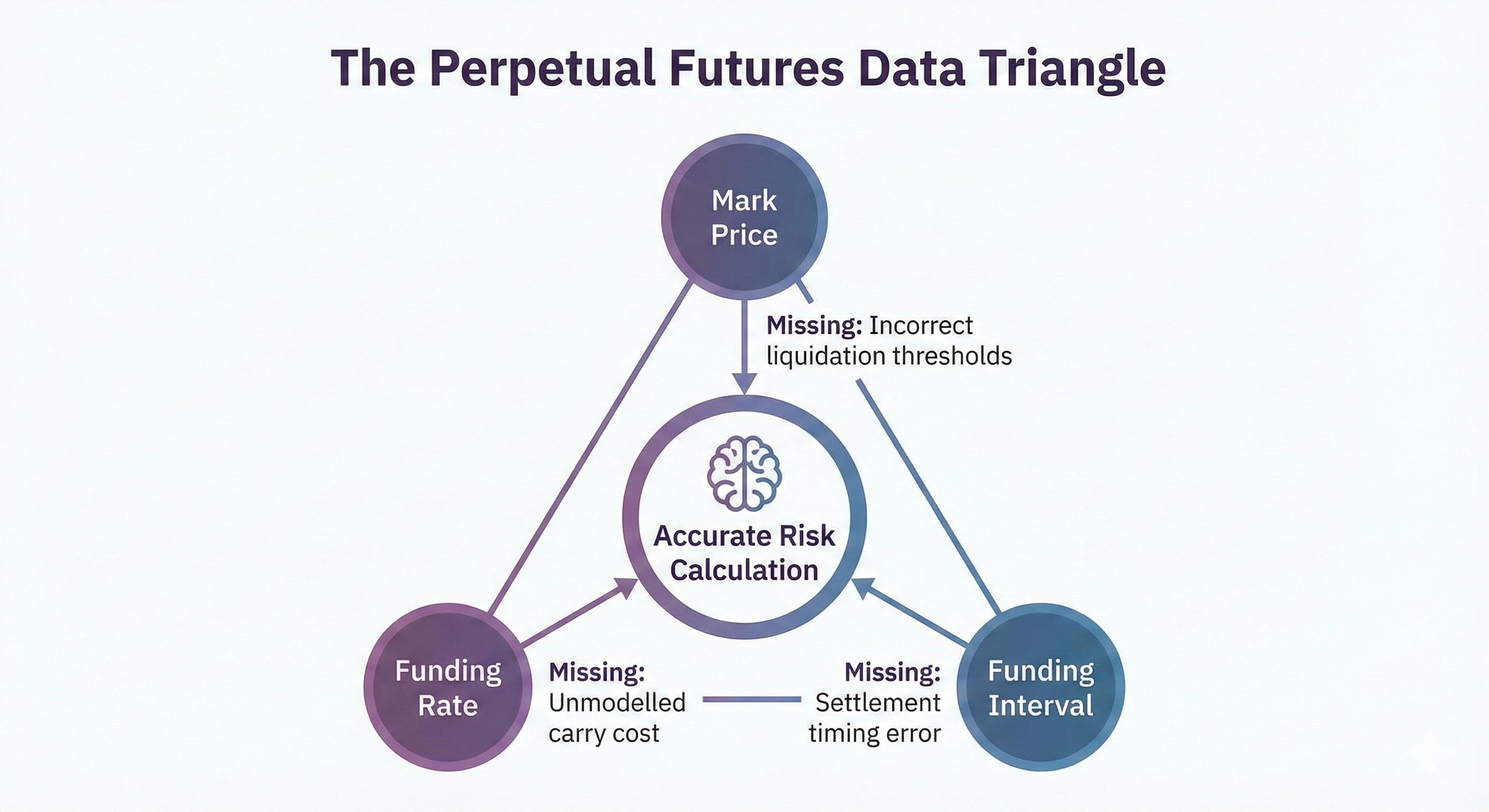 The Perpetual Futures Data Triangle: three nodes (Mark Price, Funding Rate, Funding Interval) connected to a central node labelled Accurate Risk Calculation. Each edge shows the consequence of missing that data: incorrect liquidation thresholds, unmodelled carry cost, settlement timing error.